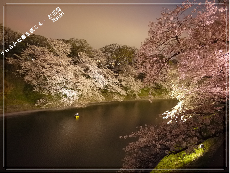 (千鳥淵的夜櫻。看起來很像靜止的河水面,其實正飄著毛毛雨,一旁還有印度文化交流會的叫喊聲